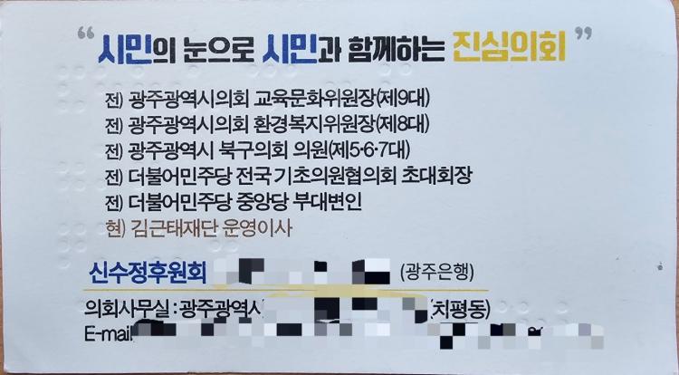 광주시의회 관계자는 “의원에게 지급한 명함 제작비는 집행여부를 확인하지만, 명함 이미지 자체는 확인하지 않아 후원계좌 기재 여부는 확인할 수 없다”고 밝혔다.