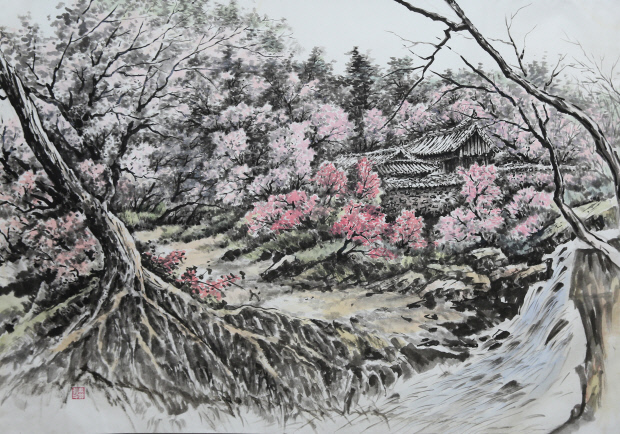 작품 ‘산사의 봄 전경’은 겨울을 이겨내고 봄을 맞는 사찰의 풍광을 초점화한 작품이다. 연분홍 봄꽃들이 무리지어 피어난 산사 주위는 봄기운이 물씬 배어나온다. 지난 겨울의 혹독했던 추위를 견뎌내고 봄을 맞는 나무들과 고목들에서도 약동하는 기운이 느껴진다.