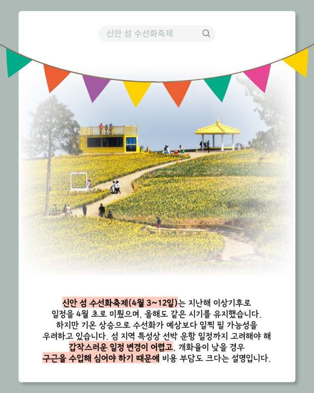이에 광양시, 구례군, 여수시, 신안군 등은 개화 시기를 예측하며 축제 일정을 늦추거나 조정 중이다.