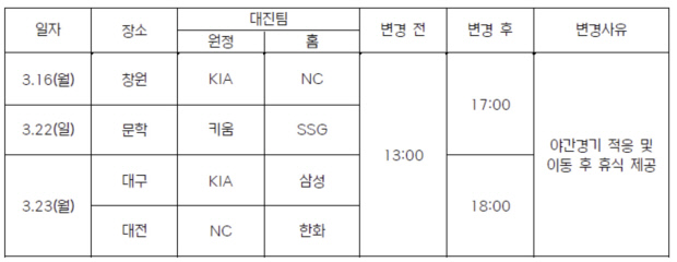 3월 23일 대구에서 열리는 KIA와 삼성 경기 시간도 오후 1시에서 오후 6시로 변경됐다.