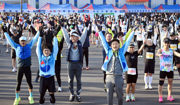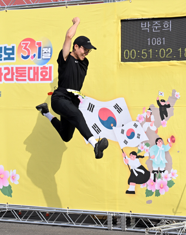 | 전국의 마라토너들이 출발 전 3·1절의 의미를 되새기며 만세삼창을 하고 있다. |