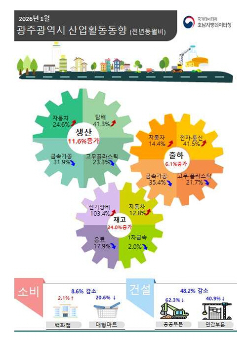 광주 1월 중 광공업생산지수는 136.5로 1년 전보다 11.6% 상승했다. 업종별로 지역 주요 산업인 자동차(24.6%)를 비롯해 담배(41.3%), 전자·통신(47.7%) 등이 증가했고, 금속가공(-31.9%), 고무·플라스틱(-23.3%) 등은 감소했다.