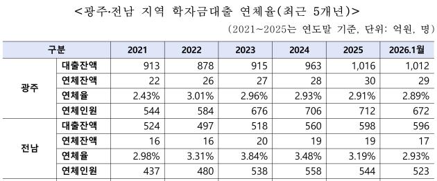 광주·전남 연체율은 전국 연체율 2.53%를 웃돌았다. 광주에 사는 672명은 29억원의 학자금 대출액을 갚지 못했고, 전남 523명은 17억원을 연체했다. 1명당 연체액이 광주 432만원, 전남 325만원인 셈이다.