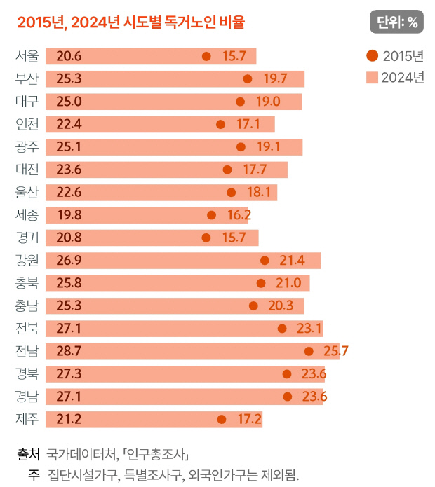 7일 국가데이터처가 발표한 ‘국민 삶의 질’ 자료에 따르면 2024년 기준 65세 이상 노인인구 중 혼자 사는 노인 비중은 광주 19.1%·전남 25.7%였다.