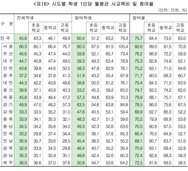 평균 사교육비가 전국적으로 줄었지만 수도권과 지역 격차는 여전히 컸다.